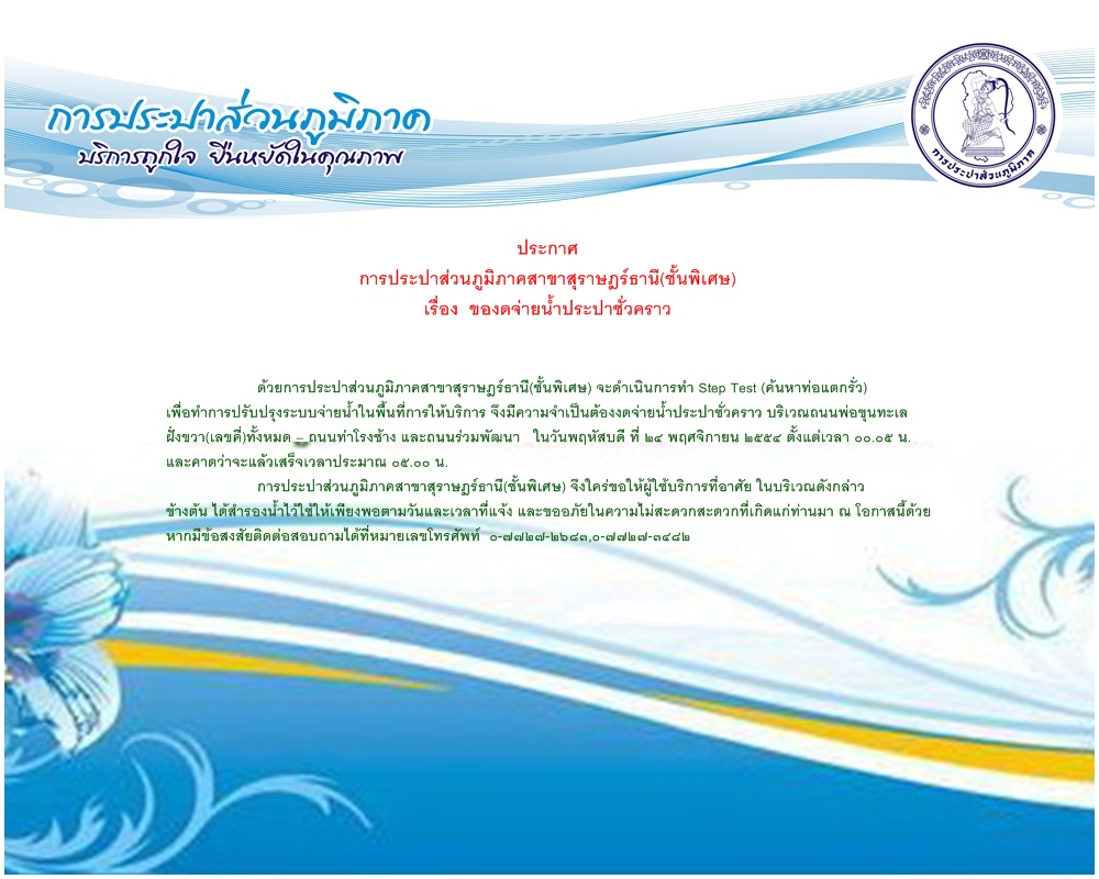 ประกาศการประปาส่วนภูมิภาคสาขาสุราษฎร์ธานี(ชั้นพิเศษ)เรื่อง ของดจ่ายน้ำประปาชั่วคราว