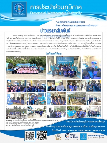วันที่ 17 กุมภาพันธ์ 2566 การประปาส่วนภูมิภาคสาขาพัทลุง นำโดยนายบัญญัติ จุลรอด ผู้จัดการการประปาส่วนภูมิภาคสาขาพัทลุง มอบหมาย นายวิรันต์โรจน์ พงษ์อักษร หัวหน้างานผลิต กปภ.สาขาพัทลุง และพนักงานในสังกัด ร่วมกับ งานลูกค้าสัมพันธ์ กปภ.ข.5 จัดกิจกรรมโครงการ "อาสาประปาเพื่อปวงชน" เพื่อส่งมอบและแบ่งปันความรู้ประสบการณ์และความสามารถด้านวิชาชีพประปาให้กับเด็กและเยาวชนในโรงเรียน เช่น ความรู้เกี่ยวกับขั้นตอนการผลิตน้ำประปา การตรวจสอบคุณภาพน้ำ การตรวจสอบซ่อมแซมท่อแตกท่อรั่วภายในบ้าน เป็นต้น พร้อมทั้งสร้าง"เครือข่ายฮีโร่น้อยอาสาพิทักษ์น้ำ" ให้ช่วยกันสอดส่องดูแลทรัพยากรน้ำ โดยกิจกรรมครั้งนี้มีคณะอาจารย์และนักเรียนจำนวน 37 คน จากโรงเรียนอนุบาลพัทลุง และโรงเรียนสตรีพัทลุง เข้าร่วมกิจกรรม ณ สถานีผลิตน้ำนาท่อม กปภ.สาขาพัทลุง