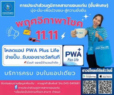 (วันนี้) วันพุธที่ 8พฤศจิกายน 2566การประปาส่วนภูมิภาคสาขาขอนแก่น (ชั้นพิเศษ) นำโดยนางสาวนฤมล ประภาสมุทร ผู้ช่วยผู้จัดการ การประปาส่วนภูมิภาค (ชั้นพิเศษ) สาขาขอนแก่นพร้อมด้วยนางอลิสรา เที่ยงตรง หัวหน้างานลูกค้าสัมพันธ์ และพนักงานในสังกัด เชิญชวนลูกค้าร่วมกิจกรรม 11.11 #พฤศจิกาพาโชค ต้อนรับเดือนพฤศจิกายน 2566ในแคมเปญ "PWA พาโชค โหลดแอปจ่ายค่าน้ำ" รับทันที ของที่ระลึกจาก กปภ.สาขาขอนแก่น (สำหรับลูกค้าที่ใช้บริการชำระค่าน้ำประปาผ่านแอปพลิเคชั่น PWA Plus Life)