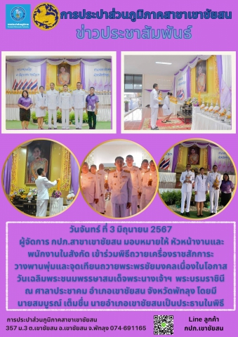 ผู้จัดการ กปภ.สาขาเขาชัยสน มอบหมายให้ หัวหน้างานและ พนักงานในสังกัด เข้าร่วมพิธีถวายเครื่องราชสักการะ วางพานพุ่มและจุดเทียนถวายพระพรชัยมงคลเนื่องในโอกาส วันเฉลิมพระชนมพรรษาสมเด็จพระนางเจ้าฯ พระบรมราชินี ณ ศาลาประชาคม อำเภอเขาชัยสน จังหวัดพัทลุง โดยมี นายสมบูรณ์ เต็มชื่น นายอำเภอเขาชัยสนเป็นประธานในพิธี