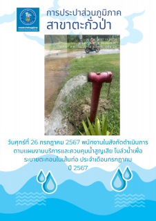 วันศุกร์ที่ 26 กรกฎาคม 2567 การประปาส่วนภูมิภาคสาขาตะกั่วป่า โดยพนักงานในสังกัด ดำเนินการตามแผนงานบริการและควบคุมน้ำสูญเสีย โบล์วตะกอน ตามแผนระบายตะกอนในเส้นท่อ พื้นที่ถนนวงศ์พานิช ตำบลบางนายสี อำเภอตะกั่วป่า จังหวัดพังงา เพื่อรักษาคุณภาพน้ำประปาให้ใสสะอาด ตามมาตรฐานของ กปภ. มุ่ง มั่น เพื่อปวงชน สู่ความยั่งยืน ด้วยความห่วงใย จาก กปภ.สาขาตะกั่วป่า นายธำรง คุ้มเพชร ผู้จัดการ กปภ.สาขาตะกั่วป่า หัวหน้างาน พนักงาน และลูกจ้างในสังกัด กปภ.สาขาตะกั่วป่า