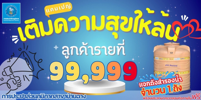 การประปาส่วนภูมิภาคสาขาบ้านฉาง มอบถังสำรองน้ำให้ลูกค้ารายที่ 99,999 : การประปาส่วนภูมิภาคสาขาบ้านฉาง จัดแคมเปญพิเศษมอบของขวัญให้กับลูกค้าคนสำคัญ โดยลูกค้ารายที่ 99,999 จะได้รับถังสำรองน้ำ จำนวน 1 ถัง พร้อมบริการตรวจสอบจุดรั่วภายในบ้านฟรี โดยเมื่อวันที่ 10 ตุลาคม 2567 นายสราวุธ เอี่ยมสงคราม รองผู้ว่าการ(ปฏิบัติการ 3) พร้อมด้วยคณะผู้บริหาร กปภ.สาขาบ้านฉาง ได้ทำการส่งมอบถังสำรองน้ำให้กับลูกค้าผู้โชคดีเป็นที่เรียบร้อยแล้ว กิจกรรมในครั้งนี้จัดขึ้นเพื่อเป็นการขอบคุณลูกค้าที่ไว้วางใจใช้บริการ กปภ.สาขาบ้านฉาง และเพื่อส่งเสริมการสำรองน้ำอย่างเหมาะสมในครัวเรือน