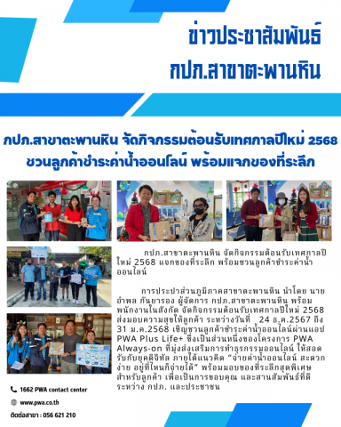 การประปาส่วนภูมิภาคสาขาตะพานหิน นำโดย นายอำพล กันยารอง ผู้จัดการ กปภ.สาขาตะพานหิน พร้อมพนักงานในสังกัด จัดกิจกรรมต้อนรับเทศกาลปีใหม่ 2568 ระหว่างวันที่ 24 ธ.ค.2567 - 31 ม.ค.2568 ส่งมอบความสุขให้ลูกค้า เชิญชวนลูกค้าชำระค่าน้ำออนไลน์ผ่านแอป PWA Plus Life+ ซึ่งเป็นส่วนหนึ่งของโครงการ PWA Always-on ที่มุ่งส่งเสริมการทำธุรกรรมออนไลน์ ให้สอดรับกับยุคดิจิทัล ภายใต้แนวคิด "จ่ายค่าน้ำออนไลน์ สะดวก ง่าย อยู่ที่ไหนก็จ่ายได้" พร้อมมอบของที่ระลึกสุดพิเศษสำหรับลูกค้า เพื่อเป็นการขอบคุณ และสานสัมพันธ์ที่ดีระหว่าง กปภ. และประชาชน