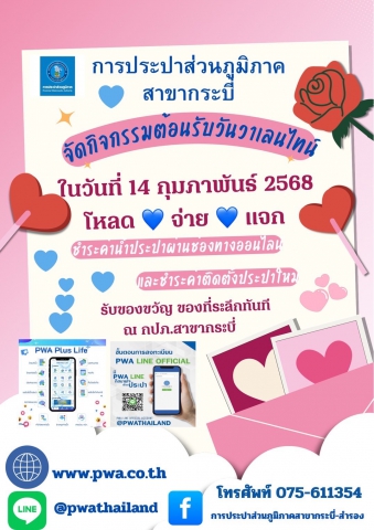 วันที่ 14 กุมภาพันธ์ 2568 การประปาส่วนภูมิภาคสาขากระบี่ จัดกิจกรรมส่งมอบความรัก วันวาเลนไทน์ เชิญชวนให้ลุกค้าดาวโหลด Appication PWA Plus Life+ หรือ แอดไลน์ @pwathailand สำหรับลูกค้าที่ชำระค่าน้ำผ่านชอ่งทางออนไลน์ และ ลูกค้าที่มาชำระค่าติดตั้งรายใหม่ แล้วรับของขวัญ ของที่ระลึกฟรีทันที ณ กปภ.สาขากระบี่ ในการจัดกิจกรรมในครั้งนี้ ลูกค้าได้รับความสะดวกในการชำระค่าน้ำ สร้างสัมพันธ์อันดีกับลูกค้าเก่าและสร้างความพึงพอใจ ประทับใจให้กับลูกค้าใหม่ที่มาใช้บริการ