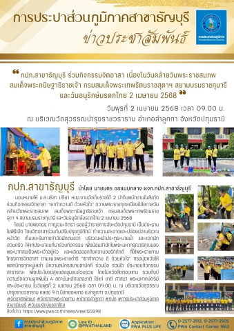 กปภ.สาขาธัญบุรี โดย นายนคร ขอแนบกลาง ผู้จัดการการประปาส่วนภูมิภาคสาขาธัญบุรี มอบหมายให้ น.ส.นริสา ปรีชา หัวหน้างาน 8 งานจัดเก็บรายได้ 2 นำทีมพนักงานในสังกัด ร่วมกิจกรรมจิตอาสา "เราทำความดี ด้วยหัวใจ" ถวายพระราชกุศล เนื่องในโอกาสวันคล้ายวันพระราชสมภพ สมเด็จพระกนิษฐาธิราชเจ้า กรมสมเด็จพระเทพรัตนราชสุดา ฯ สยามบรมราชกุมารี และวันอนุรักษ์มรดกไทย 2 เมษายน 2568