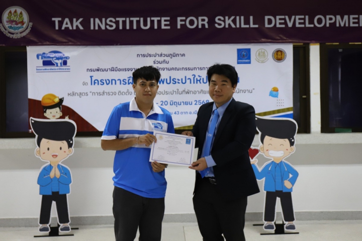 นอกจากนั้น หลังเสร็จสิ้นการฝึกอบรมได้มีการมอบวุฒิบัตรรับรองให้แก่ผู้ที่ผ่านการฝึกอบรม โดยได้รับเกียรติจาก นายสุทธิรักษ์ กาบแก้ว ผู้อำนวยการกองระบบจำหน่าย กปภ.ข.10 นายวรัตม์ฐนัน ศิริวัฒน์ ผู้จัดการการประปาส่วนภูมิภาคสาขาตาก และนายอรรถกฤช สนธิสุทธิ์ ผู้อำนวยการกลุ่มงานแผนสารสนเทศ ผู้แทนผู้อำนวยการสถาบันพัฒนาฝีมือแรงงาน 43 ตาก ร่วมมอบวุฒิบัตร แก่ผู้ผ่านการฝึกอบรม อีกด้วย