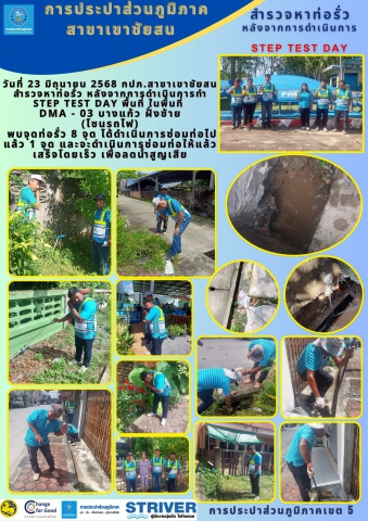 วันที่ 23 มิถุนายน 2568 การประปาส่วนภูมิภาคสาขาเขาชัยสน นำโดย นายณัฐยุทธ โชโต ผู้จัดการ พร้อมด้วยหัวหน้างานและพนักงานในสังกัด เดินสำรวจหาท่อรั่ว หลังจากการดำเนินการทำ STEP TEST DAY พื้นที่ ในพื้นที่ DMA - 03 บางแก้ว ฝั่งซ้าย (โซนรถไฟ) พบจุดท่อรั่ว 8 จุด ได้ดำเนินการซ่อมท่อ PB 50 มม.ไปแล้ว 1 จุด และจะดำเนินการซ่อมท่อให้แล้วเสร็จโดยเร็ว เพื่อลดน้ำสูญเสีย