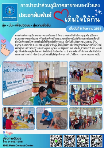 การประปาส่วนภูมิภาคสาขาหนองบัวแดง นำโดย นายธนานันป์ เอี่ยมบุญเสริฐ ผู้จัดการ กปภ.สาขาหนองบัวแดง พร้อมด้วยหัวหน้างาน และพนักงานในสังกัด ออกหน่วยเคลื่อนที่ดำเนินกิจกรรมโครงการเติมใจให้กัน เมื่อวันที่ 17 กรกฎาคม 2568 ณ บ้านฉนวน ต.หนองข่า อ.เกษตรสมบูรณ์ จ.ชัยภูมิ โดยให้บริการรับชำระค่าติดตั้งมาตรวัดน้ำใหม่ และได้มอบน้ำดื่มบรรจุขวดตราสัญลักษณ์ กปภ. จำนวน 120 ขวด เพื่อเป็นการอำนวยความสะดวกให้กับลูกค้า โดยมีผู้มาชำระค่าติดตั้ง จำนวน 70 ราย และมีผู้มายื่นคำร้องขอติดตั้งมาตรวัดน้ำใหม่เพิ่มอีก จำนวน 7 ราย พร้อมนี้ได้ประชาสัมพันธ์ช่องทางการชำระค่าน้ำประปาออนไลน์ เพื่อให้ลูกค้าของ กปภ. ได้รับความสะดวกและรวดเร็ว