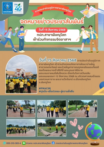 วันศุกร์ที่ 15 สิงหาคม 2568 กปภ.สาขาพิษณุโลก นำโดยนางสาวนงนาฎ เนียมสกุล ผู้จัดการ กปภ.สาขาพิษณุโลก มอบหมายให้หัวหน้างานและพนักงานในสังกัด เข้าร่วมกิจกรรมจิตอาสาพัฒนาบำเพ็ญสาธารณประโยชน์และบำเพ็ญสาธารณกุศลเฉลิมพระเกียรติสมเด็จพระนางเจ้าสิริกิติ์ พระบรมราชินีนาถ พระบรมราชชนนีพันปีหลวง เนื่องในโอกาสวันเฉลิมพระชนมพรรษา 12 สิงหาคม 2568 (วันแม่แห่งชาติ) ณ บริเวณศาลสมเด็จพระนเรศวรมหาราช พระราชวังจันทน์ อ.เมืองพิษณุโลก จ.พิษณุโลก