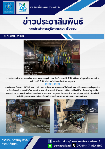 วันที่ 9 กันยายน 2568 บริหารงานโดย นายธีระพล โชคคณาพิทักษ์ ผจก.กปภ.สาขาหลังสวน มอบหมายให้หัวหน้า งานบริการควบคุมน้ำสูญเสีย พร้อมทั้งพนักงานในสังกัด ออกสำรวจหาท่อแตก-ท่อรั่ว และดำเนินการปรับPRV เพื่อลดน้ำสูญเสียของหน่วยบริการสวี ในพื้นที่ ต.นาโพธิ์ อ.หลังสวน จ.ชุมพร โดยการสำรวจหาท่อแตก-ท่อรั่ว ในครั้งนี้ เพื่อให้ลูกค้าของ กปภ.ได้ใช้น้ำอุปโภค บริโภค อย่างมีประสิทธิภาพและทั่วถึง