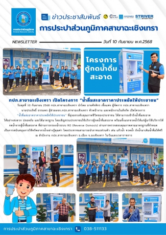 วันพุธที่ 10 กันยายน 2568 กปภ.สาขาฉะเชิงเทรา นำโดย นายศักดิกร เชื้อแพ่ง ผู้จัดการ กปภ.สาขาฉะเชิงเทรา นายประภัทธิ์ ธรรมพร ผู้ช่วย ผจก.กปภ.สาขาฉะเชิงเทรา หัวหน้างาน และพนักงานในสังกัด เปิดโครงการ "น้ำดื่มสะอาดราคาประหยัดให้ประชาชน" ที่มุ่งยกระดับคุณภาพชีวิตของประชาชน ให้สามารถเข้าถึงน้ำดื่มสะอาดได้อย่างสะดวก ปลอดภัย และได้มาตรฐาน โดยเชิญชวนประชาชนใช้บริการตู้กดน้ำดื่มสะอาด พร้อมทั้งแจกขวดน้ำให้แก่ผู้มาใช้บริการได้กดน้ำจากตู้น้ำดื่มสะอาด ที่ผ่านการกรองน้ำระบบ RO (Reverse Osmosis) ผ่านการตรวจสอบคุณภาพตามมาตรฐานที่กำหนด เป็นการสนับสนุนการใช้ทรัพยากรน้ำอย่างรู้คุณค่า โดยประชาชนสามารถนำภาชนะส่วนตัว เช่น แก้วน้ำ ขวดน้ำ ถังน้ำมาเติมน้ำดื่มได้ฟรี ณ สำนักงาน กปภ.สาขาฉะเชิงเทรา อ.เมือง จ.ฉะเชิงเทรา ในวันและเวลาราชการ