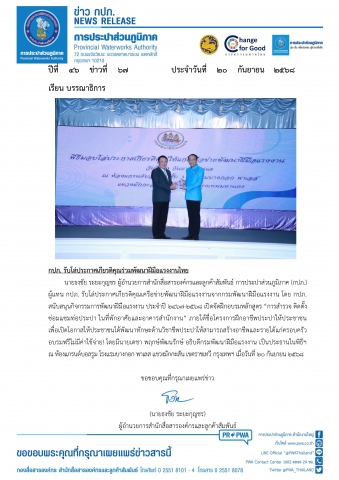 กปภ. รับโล่ประกาศเกียรติคุณร่วมพัฒนาฝีมือแรงงานไทย