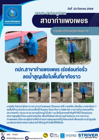 เพื่อแก้ไขปัญหาดังกล่าวอย่างเร่งด่วน ทาง กปภ.สาขากำแพงเพชรได้ประสานผู้รับจ้างให้เข้าดำเนินการซ่อมแซมท่อที่รั่วทั้งหมดทันที เพื่อลดปริมาณน้ำสูญเสียและเพิ่มประสิทธิภาพในการส่งจ่ายน้ำให้กับลูกค้าในพื้นที่ให้ดียิ่งขึ้น