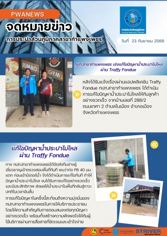 หลังได้รับแจ้งเรื่องผ่านแอปพลิเคชัน Traffy Fondue กปภ.สาขากำแพงเพชร ได้ดำเนินการแก้ไขปัญหาน้ำประปาไม่ไหลให้กับลูกค้าอย่างรวดเร็ว จากบ้านเลขที่ 288/2 ถนนเทศา 2 ตำบลในเมือง อำเภอเมือง จังหวัดกำแพงเพชร
