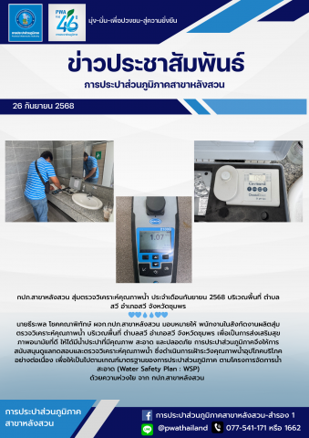 วันที่ 26 กันยายน 2568 กปภ.สาขาหลังสวน ภายใต้การบริหารงานของ นายธีระพล โชคคณาพิทักษ์ ผจก.กปภ.สาขาหลังสวน มอบหมายให้ พนักงานในสังกัดงานผลิต สุ่มตรวจวิเคราะห์คุณภาพน้ำ บริเวณพื้นที่ ตำบลสวี อำเภอสวี จังหวัดชุมพร เพื่อเป็นการส่งเสริมสุขภาพอนามัยที่ดี ให้ได้มีน้ำประปาที่มีคุณภาพ สะอาด และปลอดภัย การประปาส่วนภูมิภาคจึงให้การสนับสนุนดูแลทดสอบและตรวจวิเคราะห์คุณภาพน้ำ ซึ่งดำเนินการเฝ้าระวังคุณภาพน้ำอุปโภคบริโภคอย่างต่อเนื่อง เพื่อให้เป็นไปตามเกณฑ์มาตรฐานของการประปาส่วนภูมิภาค ตามโครงการจัดการน้ำสะอาด (Water Safety Plan : WSP)