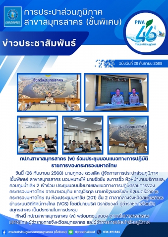 วันนี้ (26 กันยายน 2568) นายภูทอง ดวงเลิศ ผู้จัดการการประปาส่วนภูมิภาค (ชั้นพิเศษ) สาขาสมุทรสาคร มอบหมายให้ นายชัชชัย ละการชั่ว หัวหน้างานบริการและควบคุมน้ำเสีย 2 เข้าร่วม ประชุมมอบนโยบายและแนวทางการปฎิบัติราชการของกระทรวงมหาดไทย จากนายอนุทิน ชาญวีรกุล นายกรัฐมนตรีและ รัฐมนตรีว่าการกระทรวงมหาดไทย ณ ห้องประชุมมหาชัย (201) ชั้น 2 ศาลากลางจังหวัดสมุทรสาคร ผ่านระบบวิดีทัศน์ทางไกล (VCS) โดยมีนายนริศ นิรามัยวงศ์ ผู้ว่าราชการจังหวัดสมุทรสาคร เป็นประธานในการประชุม ทั้งนี้ กปภ.สาขาสมุทรสาคร (พ) พร้อมตอบสนอง ตามนโยบายกระทรวงมหาดไทย ผู้ว่าราชการจังหวัดสมุทรสาคร และผู้ว่าการการประปาส่วนภูมิภาค