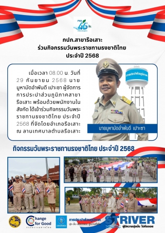 29 กันยายน 2568 เมื่อเวลา 08.00 น. วันที่ 29 กันยายน 2568 นายมูหามัดอำพันดี เปาะซา ผู้จัดการการประปาส่วนภูมิภาคสาขารือเสาะ พร้อมด้วยพนักงานในสังกัด ได้เข้าร่วมกิจกรรมวันพระราชทานธงชาติไทย ประจำปี 2568 ที่จัดโดยอำเภอรือเสาะ ณ ลานเทศบาลตำบลรือเสาะ Share