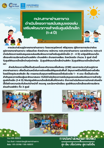 ซึ่งเป็นช่วงวัยสำคัญของการเรียนรู็และพัฒนาสมอง จึงได้ดำเนินโครงการสนับสนุนของเล่นเสริมพัฒนาการสำหรับศูนย์เด็กเล็ก (1-4 ปี)ให้แก่ศูนย์พัฒนาเด็กเล็กในพื้นที่ดังกล่าว