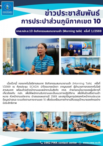 เมื่อเร็วๆนี้ กองเทคโนโลยีสารสนเทศ จัดกิจกรรมสนทนายามเช้า (Morning Talk) ครั้งที่ 1/2569 ณ ห้องประชุม SCADA นำโดยนางชนัดดา ชาญณรงค์ ผู้อำนวยการกองเทคโนโลยีสารสนเทศ พร้อมด้วยหัวหน้างานและพนักงานในสังกัด กทส. ถ่ายทอดนโยบายของผู้บริหารที่เกี่ยวข้องกับ กปภ. เพื่อให้พนักงานรับทราบและเป็นแนวทางปฏิบัติงาน เพื่อให้แล้วเสร็จตามเป้าหมาย หัวหน้างานแต่ละงาน นำเสนอแผนงานปี 2569 และสรุปปัญหาอุปสรรคหัวหน้างานประมวลข้อมูลนำเสนอ ระบบติดตามภาระงานเขต 10 เพื่อขับเคลื่อนการทำงานให้บรรลุเป้าหมายองค์กรอย่างมีประสิทธิภาพ