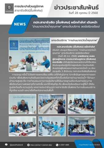(วันนี้ 28 ตุลาคม 2568) การประปาส่วนภูมิภาคสาขารังสิต(ชั้นพิเศษ) นำโดย นายเชิดชาย มนชม ผู้ช่วยผู้จัดการการประปาส่วนภูมิภาค(ชั้นพิเศษ)สาขารังสิต หัวหน้างานและพนักงานที่เกี่ยวข้อง จัดประชุมเชิงปฏิบัติการร่วมกับบริษัทผู้รับผิดชอบการอ่านมาตรวัดน้ำ ณ ห้องประชุมชั้น 3 สำนักงาน กปภ. สาขารังสิต(ชั้นพิเศษ) การประชุมครั้งนี้ ไม่ใช่แค่การแลกเปลี่ยน แต่คือเวทีสำคัญในการ "เจาะลึกปัญหาและหาทางออกร่วมกัน" เพื่อรับฟังความคิดเห็นและวิเคราะห์อุปสรรคที่เกิดขึ้นจริงในการอ่านมาตรวัดน้ำ เป้าหมายสูงสุดคือการกำหนดแนวทางการปฏิบัติงานให้เป็นมาตรฐานเดียวกันอย่างมีคุณภาพ เพื่อป้องกันความผิดพลาดที่อาจเกิดขึ้น และที่สำคัญที่สุด คือ เพื่อลดข้อร้องเรียนจากผู้ใช้น้ำให้เป็นศูนย์ สะท้อนถึงความมุ่งมั่น ของการประปาส่วนภูมิภาคสาขารังสิต(ชั้นพิเศษ)ในการส่งมอบบริการที่ถูกต้อง แม่นยำ และน่าเชื่อถือแก่ประชาชนในพื้นที่