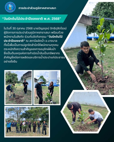 ผู้จัดการการประปาส่วนภูมิภาคสาขาเสนา พร้อมด้วยพนักงานในสังกัด ร่วมกันจัดกิจกรรม "วันรักต้นไม้ประจำปีของชาติ" ณ สถานีผลิตน้ำ อ.บางบาล