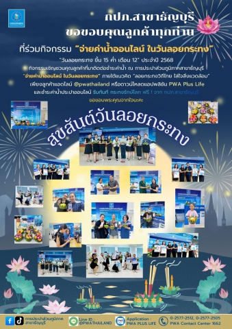 กปภ.สาขาธัญบุรี ขอขอบคุณลูกค้าทุกท่านที่ร่วมกิจกรรมใน "วันลอยกระทง ขึ้น 15 ค่ำ เดือน 12" ประจำปี 2568 ในกิจกรรมเชิญชวนคุณลูกค้าที่มาติดต่อชำระค่าน้ำ ณ การประปาส่วนภูมิภาคสาขาธัญบุรี "จ่ายค่าน้ำออนไลน์ ในวันลอยกระทง" ภายใต้แนวคิด "ลอยกระทงวิถีไทย ใส่ใจสิ่งแวดล้อมแบบยั่งยืน" เพียงลูกค้าแอดไลน์ @pwathailand หรือดาวน์โหลดแอปพลิชัน PWA Plus Life และชำระค่าน้ำประปาออนไลน์ รับทันที กระทงรักษ์โลก ฟรี ! จาก กปภ.สาขาธัญบุรี