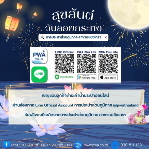 วันที่ 5 พฤศจิกายน 2568 การประปาส่วนภูมิภาคสาขาฉะเชิงเทรา โดยนายศักดิกร เชื้อแพ่ง ผู้จัดการ กปภ.สาขาฉะเชิงเทรา นายฉัตรชัย รุ่นประพันธ์ ผช.ผจก. พร้อมด้วยพนักงานและลูกจ้างในสังกัด จัดกิจกรรมสืบสานประเพณีลอยกระทง ประจำปี 2568 โดยร่วมกันทำกระทงเพื่อมอบให้แก่ผู้ใช้น้ำเพื่อสืบสานประเพณีลอยกระทง ประจำปี 2568 และเชิญชวนลูกค้าชำระค่าน้ำผ่านไลน์ @PWATHAILAND และแอปพลิเคชั่น PWA Plus Life+