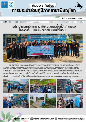 วันที่ 10 พฤศจิกายน 2568 เวลา 09.00 น. การประปาส่วนภูมิภาคสาขาพิษณุโลก ออกพบปะและให้บริการลูกค้า โครงการ "มุ่งมั่นเพื่อปวงชน เติมใจให้กัน ครั้งที่ 1/2569" โดยให้บริการด้านข้อมูลความรู้เกี่ยวกับระบบประปาเบื้องต้น และการใช้น้ำอย่างถูกวิธี พร้อมให้บริการซ่อมแซมระบบประปาภายในบ้านฟรีโดยไม่คิดค่าใช้จ่าย แนะนำประชาสัมพันธ์การชำระค่าน้ำประปาผ่านช่องทางออนไลน์โดยวิธีการใช้แอพพลิเคชั่น PWA Plus Life และ PWA Line Official "@pwathailand" ณ หน่วยบริการวังทอง ต.วังทอง อ.วังทองจ.พิษณุโลก