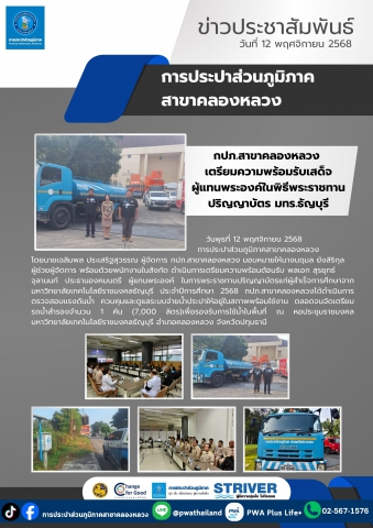 วันพุธที่ 12 พฤศจิกายน 2568 การประปาส่วนภูมิภาคสาขาคลองหลวง โดยนายเฉลิมพล ประเสริฐสุวรรณ ผู้จัดการ กปภ.สาขาคลองหลวง มอบหมายให้นางนฤมล ยังสิริกุล ผู้ช่วยผู้จัดการ พร้อมด้วยพนักงานในสังกัด ดำเนินการเตรียมความพร้อมต้อนรับ พลเอก สุรยุทธ์ จุลานนท์ ประธานองคมนตรี ผู้แทนพระองค์ ในการพระราชทานปริญญาบัตรแก่ผู้สำเร็จการศึกษาจาก มหาวิทยาลัยเทคโนโลยีราชมงคลธัญบุรี ประจำปีการศึกษา 2567 กปภ.สาขาคลองหลวงได้ดำเนินการตรวจสอบแรงดันน้ำ ควบคุมและดูแลระบบจ่ายน้ำประปาให้อยู่ในสภาพพร้อมใช้งาน ตลอดจนจัดเตรียม รถน้ำสำรองจำนวน 1 คัน (7,000 ลิตร) เพื่อรองรับการใช้น้ำในพื้นที่ ณ หอประชุมราชมงคล มหาวิทยาลัยเทคโนโลยีราชมงคลธัญบุรี อำเภอคลองหลวง จังหวัดปทุมธานี