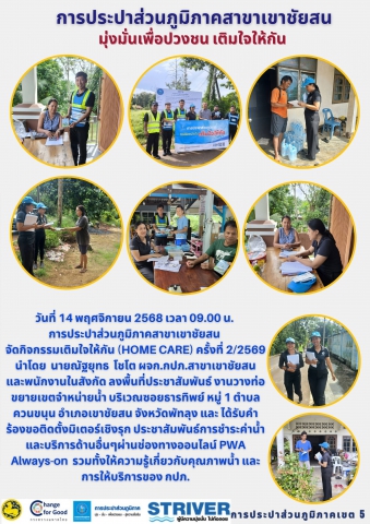 วันที่ 14 พฤศจิกายน 2568 การประปาส่วนภูมิภาคสาขาเขาชัยสน จัดกิจกรรมเติมใจให้กัน (HOME CARE) ครั้งที่ 2/2569 นำโดย นายณัฐยุทธ โชโต ผจก.กปภ.สาขาเขาชัยสน หัวหน้างาน และพนักงานในสังกัด ลงพื้นที่ประชาสัมพันธ์ งานวางท่อขยายเขตจำหน่ายน้ำ บริเวณซอยธารทิพย์ หมู่ 1 ตำบลควนขนุน อำเภอเขาชัยสน จังหวัดพัทลุง และได้รับคำร้องขอติดตั้งมิเตอร์ประปาเชิงรุก ประชาสัมพันธ์การชำระค่าน้ำและบริการด้านอื่นๆผ่านช่องทางออนไลน์ PWA Always-on รวมทั้งให้ความรู้เกี่ยวกับคุณภาพน้ำ และการให้บริการของ กปภ.