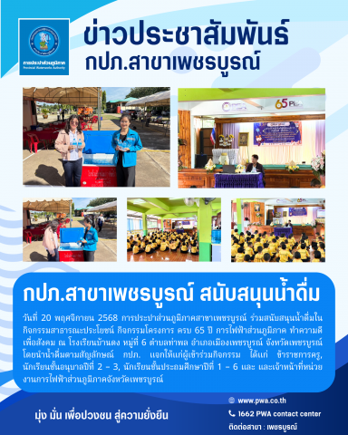 วันที่ 20 พฤศจิกายน 2568การประปาส่วนภูมิภาคสาขาเพชรบูรณ์ ร่วมสนับสนุนน้ำดื่มในกิจกรรมสาธารณะประโยชน์ กิจกรรมโครงการ ครบ 65 ปี การไฟฟ้าส่วนภูมิภาค ทำความดี เพื่อสังคม ณ โรงเรียนบ้านดง หมู่ที่ 6 ตำบลท่าพล อำเภอเมืองเพชรบูรณ์ จังหวัดเพชรบูรณ์ โดยนำน้ำดื่มตามสัญลักษณ์ กปภ. แจกให้แก่ผู้เข้าร่วมกิจกรรม ได้แก่ ข้าราชการครู, นักเรียนชั้นอนุบาลปีที่ 2 – 3, นักเรียนชั้นประถมศึกษาปีที่ 1 – 6 และ และเจ้าหน้าที่หน่วยงานการไฟฟ้าส่วนภูมิภาคจังหวัดเพชรบูรณ์