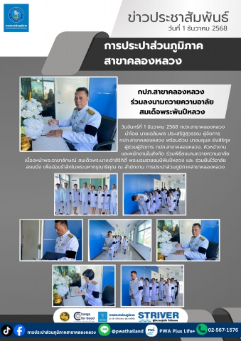 วันจันทร์ที่ 1 ธันวาคม 2568 กปภ.สาขาคลองหลวง นำโดย นายเฉลิมพล ประเสริฐสุวรรณ ผู้จัดการ กปภ.สาขาคลองหลวง พร้อมด้วย นางนฤมล ยังสิริกุล ผู้ช่วยผู้จัดการ กปภ.สาขาคลองหลวง, หัวหน้างาน และพนักงานในสังกัด ร่วมพิธีลงนามถวายความอาลัยเบื้องหน้าพระฉายาลักษณ์ สมเด็จพระนางเจ้าสิริกิติ์ พระบรมราชชนนีพันปีหลวง และ ร่วมยืนไว้อาลัยสงบนิ่ง เพื่อน้อมรำลึกในพระมหากรุณาธิคุณ ณ สำนักงาน การประปาส่วนภูมิภาคสาขาคลองหลวง