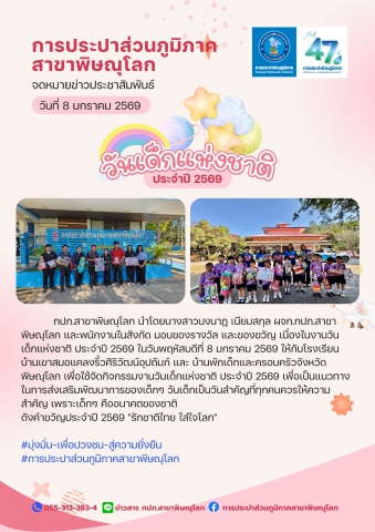 กปภ.สาขาพิษณุโลก นำโดยนางสาวนงนาฎ เนียมสกุล ผจก.กปภ.สาขาพิษณุโลก และพนักงานในสังกัด มอบของรางวัล และของขวัญ เนื่องในงานวันเด็กแห่งชาติ ประจำปี 2569 ในวันพฤหัสบดีที่ 8 มกราคม 2569 ให้กับโรงเรียนบ้านเขาสมอแคลงริ้วศิริวัฒน์อุปถัมภ์ และ บ้านพักเด็กและครอบครัวจังหวัดพิษณุโลก เพื่อใช้จัดกิจกรรมงานวันเด็กแห่งชาติ ประจำปี 2569 เพื่อเป็นแนวทางในการส่งเสริมพัฒนาการของเด็กๆ วันเด็กเป็นวันสำคัญที่ทุกคนควรให้ความสำคัญ เพราะเด็กๆ คืออนาคตของชาติ ดังคำขวัญประจำปี 2569 "รักชาติไทย ใส่ใจโลก"