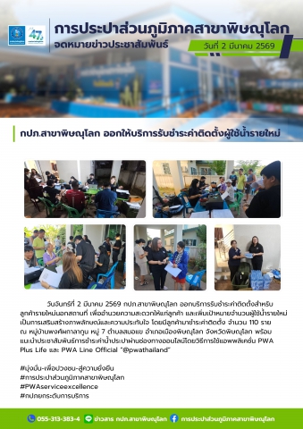 วันจันทร์ที่ 2 มีนาคม 2569 เวลา 15.30 น. กปภ.สาขาพิษณุโลก นำโดยนางสาวนงนาฎ เนียมสกุล ผู้จัดการ กปภ.สาขาพิษณุโลก มอบหมายให้หัวหน้างานและพนักงานในสังกัด ออกบริการรับชำระค่าติดตั้งสำหรับลูกค้ารายใหม่นอกสถานที่ เพื่ออำนวยความสะดวกให้แก่ลูกค้า และเพิ่มเป้าหมายจำนวนผู้ใช้น้ำรายใหม่ เป็นการเสริมสร้างภาพลักษณ์และความประทับใจ โดยมีลูกค้ามาชำระค่าติดตั้ง จำนวน 110 ราย ณ หมู่บ้านพงศ์ผกาลากูน หมู่ 7 ตำบลสมอแข อำเภอเมืองพิษณุโลก จังหวัดพิษณุโลก พร้อมแนะนำประชาสัมพันธ์การชำระค่าน้ำประปาผ่านช่องทางออนไลน์โดยวิธีการใช้แอพพลิเคชั่น PWA Plus Life และ PWA Line Official "@pwathailand"