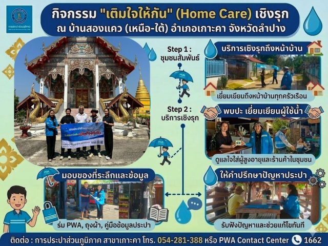 เมื่อวันที่ 18 มีนาคม 2569 ประปาส่วนภูมิภาค (กปภ.) สาขาเกาะคา นำโดย นายปรีชาวุฒิ นาคยิ้ม ผู้จัดการ กปภ.สาขาเกาะคา และพนักงานสังกัดลงพื้นที่พบปะพี่น้องประชาชน ณ หมู่บ้านสองแควใต้ - สองแควเหนือ ต.นาแก้ว อ.เกาะคา จ.ลำปาง ในกิจกรรมโครงการ "เติมใจให้กัน" (Home Care) เพื่อสร้างความสัมพันธ์อันดีและยกระดับการบริการให้เข้าถึงผู้ใช้น้ำมากยิ่งขึ้น