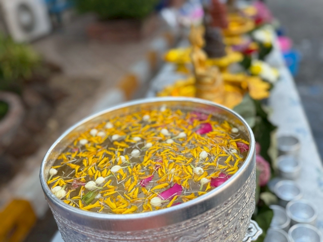 สรงน้ำพระพุทธรูป: ร่วมกันสรงน้ำพระพุทธรูปประจำสำนักงาน เพื่อความเป็นสิริมงคลและชำระล้างจิตใจให้บริสุทธิ์ผ่องใส