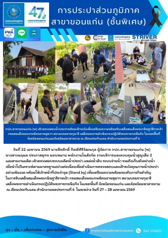 วันที่ 22 เมษายน 2569 นายธีรศักดิ์ กิตติศิริวัฒนกุล ผู้จัดการ กปภ.สาขาขอนแก่น (พ) นางสาวนฤมล ประภาสมุทร มอบหมาย พนักงานในสังกัด งานบริการและควบคุมน้ำสูญเสีย 2 และสายงานผลิต เข้าตรวจสอบระบบผลิตน้ำประปา แหล่งน้ำดิบ ระบบจ่ายน้ำ รวมถึงเก็บตัวอย่างน้ำเพื่อนำไปวิเคราะห์ตามมาตรฐานอย่างต่อเนื่องเพื่อดำเนินการตรวจสอบและเฝ้าระวังคุณภาพน้ำประปาอย่างเข้มงวด พร้อมให้เจ้าหน้าที่ประจำจุด (Stand by) เพื่อเตรียมความพร้อมรองรับภารกิจสำคัญในการรับเสด็จสมเด็จพระกนิษฐาธิราชเจ้า กรมสมเด็จพระเทพรัตนราชสุดาฯ สยามบรมราชกุมารี เสด็จพระราชดำเนินทรงปฏิบัติพระราชกรณียกิจ ในเขตพื้นที่ จังหวัดขอนแก่น และจังหวัดมหาสารคาม ณ เรือนประทับแรม สำนักงานชลประทานที่ 6 ในระหว่าง วันที่ 27 – 28 เมษายน 2569