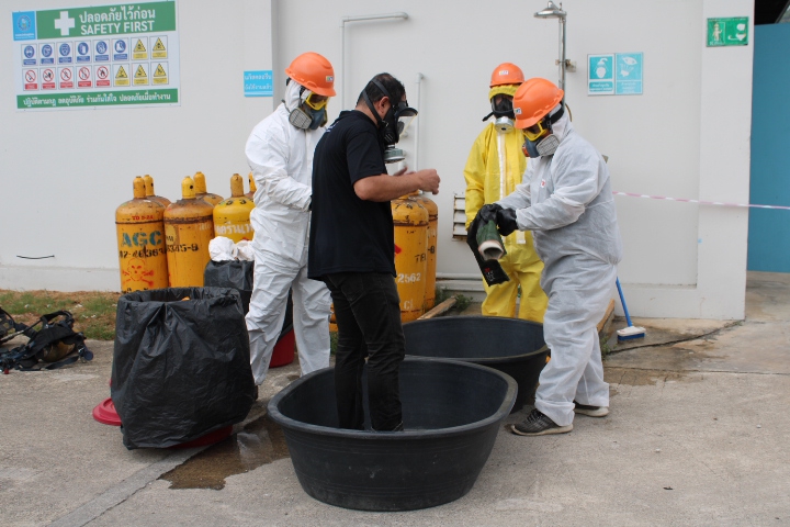 พร้อมกันนี้ ได้จำลองเหตุสถานการณ์ภาวะฉุกเฉินสารเคมีรั่วไหล ณ บริเวณโรงกรองน้ำแม่ข่าย สำนักงาน กปภ.สาขาระนอง เพื่อเตรียมความพร้อมให้พนักงานในการรับมือ กรณีเกิดเหตุสารเคมีรั่วไหลได้อย่างปลอดภัยและทันท่วงที เพื่อลดการสูญเสียในชีวิตและทรัพย์สินขององค์กร และลูกค้าที่เข้ารับบริการด้วย เมื่อวันที่ 24 เมษายน ที่ผ่านมา