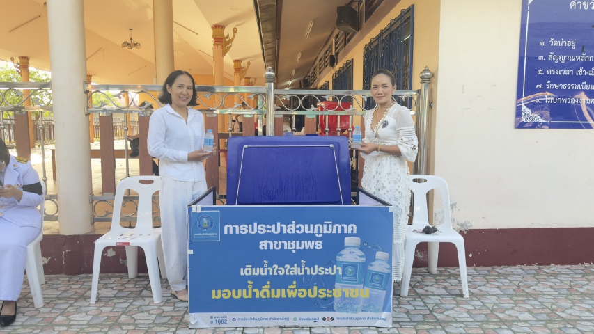 วันนี้ (วันพุธที่ 29 เมษายน 2569) เวลา 07.00 น. การประปาส่วนภูมิภาคสาขาชุมพร นำโดย นายเลอศักดิ์ รัตนฉายา ผู้จัดการการประปาส่วนภูมิภาคสาขาชุมพร ได้มอบหมายให้ นางประพรรณ แสงสุวรรณหัวหน้างานจัดเก็บรายได้ และพนักงานในสังกัด เข้าร่วมพิธีทำบุญตักบาตรถวายพระราชกุศลและพิธีถวายพระพรชัยมงคลสมเด็จพระเจ้าลูกยาเธอ เจ้าฟ้าทีปังกรรัสมีโชติมหาวชิโรตตมางกูร สิริวิบูลยราชกุมารณ วัดชุมพรรังสรรค์ (พระอารามหลวง) ตำบลนาทุ่ง อำเภอเมืองชุมพร จังหวัดชุมพร ในการนี้ การประปาส่วนภูมิภาคสาขาชุมพรได้จัดจุดบริการน้ำดื่มบรรจุขวดจำนวน 300 ขวด เพื่ออำนวยความสะดวกให้แก่ประชาชนและผู้เข้าร่วมกิจกรรม