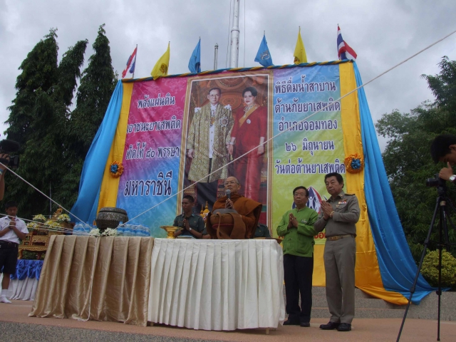 ในวันที่ ๒๕ มิถุนายน ๒๕๕๕ เวลา ๑๕ .๐๐ น. นายวรชาติ สีหบัณฑ์ ผู้จัดการ การประปาส่วนภูมิภาคสาขาจอมทอง ได้มอบหมายให้นายกฤษดา อินทรวิชา หัวหน้างาน ๗ งานผลิต นายสุรราชย์ จันทรางกูร หัวหน้างาน ๗ งานบริการและน้ำสูญเสีย และพนักงาน กปภ.สาขาจอมทอง นำน้ำดื่มบรรจุขวด จำนวน ๑,๕๐๐ ขวด มอบให้นายอำเภอจอมทอง เพื่อใช้ใน โครงการน้ำดื่มสาบานต้านยาเสพติด ในวันที่ ๒๖ มิถุนายน ๒๕๕๕ วันต่อต้านยาเสพติด “ พลังแผ่นเอาชนะยาเสพติด เทิดไท้ ๘๐ พรรษา มหาราชินิ ”