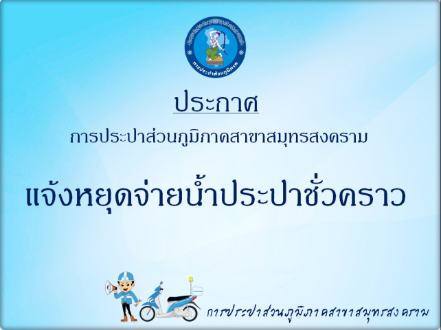 ดังนั้น การประปาส่วนภูมิภาคสาขาสมุทรสงคราม จึงขอประชาสัมพันธ์น้ำประปาหยุดไหลในพื้นที่เขตจำหน่ายน้ำของการประปาส่วนภูมิภาคสาขาสมุทรสงคราม พร้อมขออภัยในความไม่สะดวกมา ณ โอกาสนี้