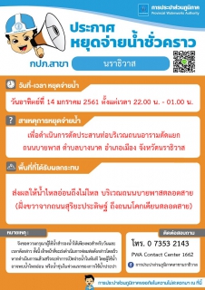 การประปาส่วนภูมิภาคสาขานราธิวาส ประกาศหบุดจ่ายน้ำชั่วคราว เพื่อดำเนินการตัดประสานท่อเมนจ่ายน้ำประปา