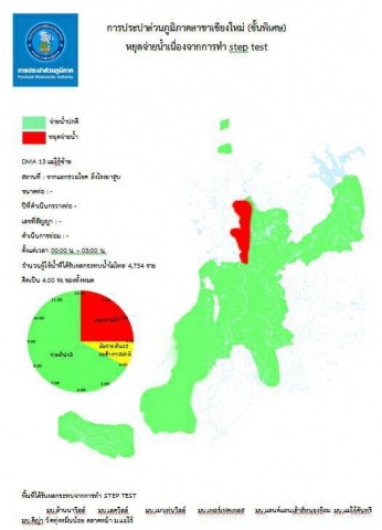 จากผลการการดำเนินงานในพื้นที่ดังกล่าว งานบริการและควบคุมน้ำสูญเสีย 1 พบว่าไม่มีท่อแตกรั่วในพื้นที่ การสำรวจหาท่อแตกรั่วในพื้นที่จ่ายน้ำด้วยวิธีการทำ Step Testจะส่งผลให้น้ำประปาไหลอ่อนหรือไม่ไหลบ้าง การประปาส่วนภูมิภาคสาขาเชียงใหม่ (ชั้นพิเศษ) จึงพิจารณาดำเนินการในช่วงเวลาที่เหมาะสม คือ ช่วงเวลากลางคืนที่มีการใช้น้ำน้อยที่สุด เพื่อลดความเดือนร้อนของประชาชนในพื้นที่ เมื่อดำเนินการแล้วเสร็จ จะส่งผลให้น้ำประปาจะไหลแรงขึ้น และคุณภาพน้ำก็จะดีขึ้น รวมทั้งปริมาณน้ำสูญเสียในพื้นที่ลดลง ทั้งนี้ หากท่านใดต้องการทราบรายละเอียด หรือต้องการร้องเรียนปัญหาต่างๆ สามารถติดต่อสอบถามได้ที่ การประปาส่วนภูมิภาคสาขาเชียงใหม่ (ชั้นพิเศษ) โทร. 053 233 477-80 PWA CALL CENTER การประปาส่วนภูมิภาค โทร. 1662