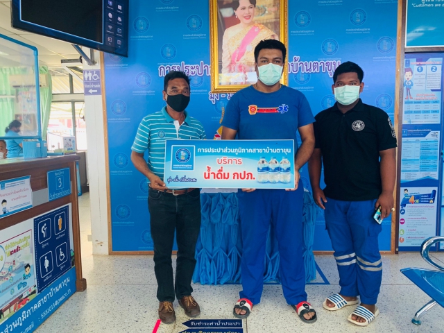 การประปาส่วนภูมิภาคสาขาบ้านตาขุนภายใต้การบริหารงานโดยนายจเร โสมาพงศ์ผู้จัดการการประปาส่วนภูมิภาคสาขาบ้านตาขุนพร้อมด้วย หัวหน้างานและพนักงานในสังกัดบริการน้ำดื่มบรรจุขวดตราสัญลักษณ์ กปภ. จำนวน 300 ขวด ร่วมบริการน้ำดื่มแก่ประชาชนและผู้เข้าร่วมโครงการอบรมการปฐมพยาบาลเบื้องต้นให้กับอาสาสมัครกู้ภัย ในวันศุกร์ ที่ 21 สิงหาคม 2563 ณ ศาลา หมู่ 4 ตำบลเขาวง อำเภอบ้านตาขุน จังหวัดสุราษฎร์ธานี (ศูนย์กู้ภัยมูลนิธิกุศลศรัทธาบ้านตาขุน – พนม อำเภอบ้านตาขุน จังหวัดสุราษฎร์ธานี)