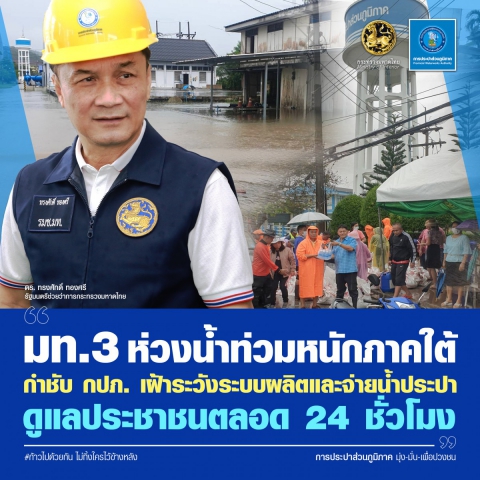 มท.3 ห่วงสถานการณ์น้ำท่วมหนักในพื้นที่ภาคใต้ กำชับการประปาส่วนภูมิภาค (กปภ.) เตรียมรับมือและเฝ้าระวังระบบผลิตและจ่ายน้ำประปาในพื้นที่ที่ได้รับผลกระทบตลอด 24 ชั่วโมง เพื่อให้มีประชาชนมีน้ำสะอาดไว้ใช้สำหรับการอุปโภคบริโภคอย่างต่อเนื่องและเพียงพอ ด้าน กปภ. ยืนยันสามารถผลิตและจ่ายน้ำได้ตามปกติ พร้อมปฏิบัติตามมาตรการแก้ไขปัญหาอุทกภัยอย่างเคร่งครัด