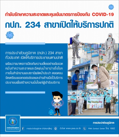 การประปาส่วนภูมิภาค (กปภ.) 234 สาขาทั่วประเทศ เปิดให้บริการประชาชนตามปกติ พร้อมวางมาตรการป้องกันความเสี่ยงอย่างเข้มงวด หมั่นทำความสะอาดและฉีดพ่นน้ำยาฆ่าเชื้อโรคภายในสำนักงานและสถานีผลิตน้ำประปา ตลอดจนจัดเตรียมแอลกอฮอล์เจลและอ่างล้างมือไว้บริการประชาชนเพื่อสร้างความมั่นใจแก่ผู้เข้ารับบริการ
