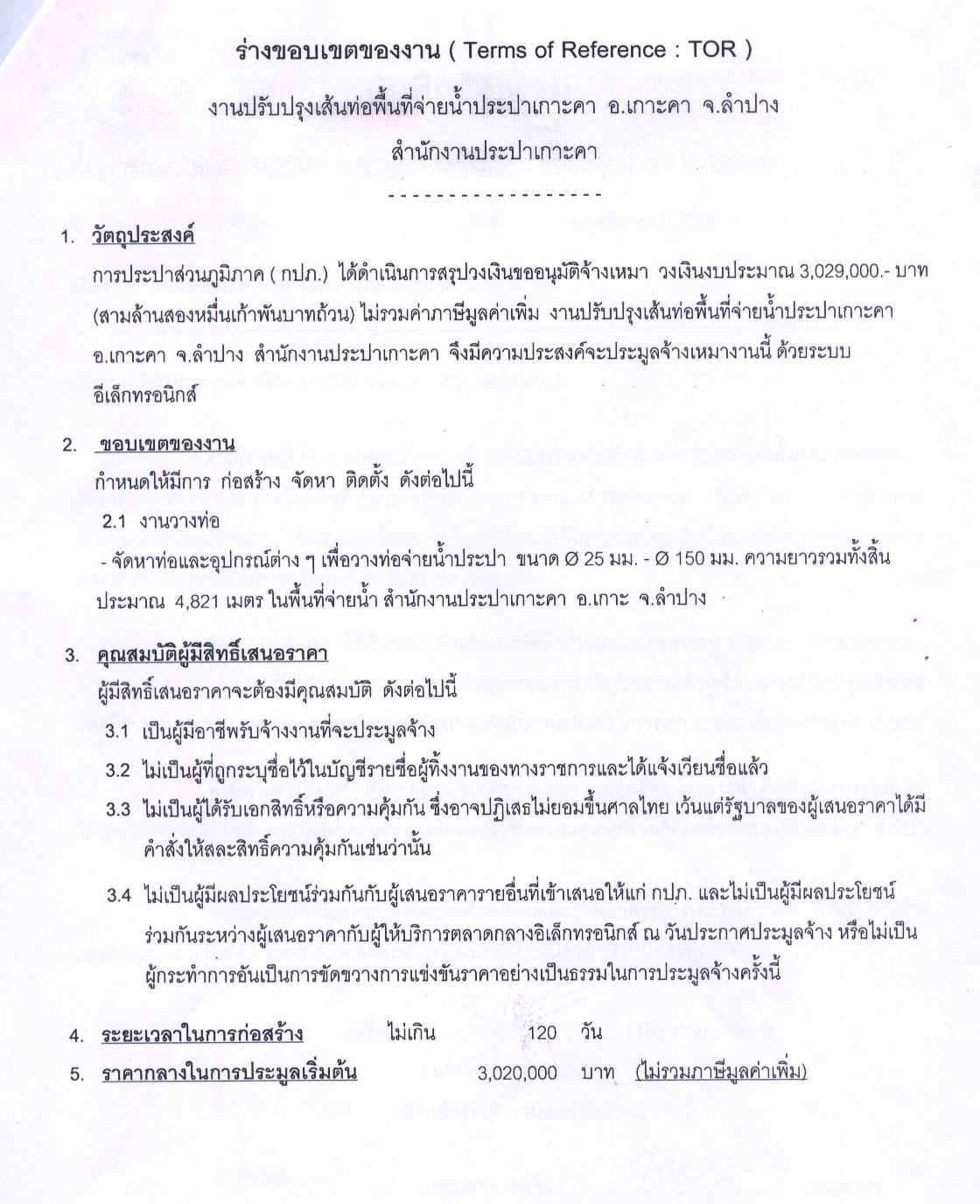 ชื่อโครงการ : งานจ้างเหมาปรับปรุงเส้นท่อพื้นที่จ่ายน้ำประปาเกาะคา อ.เกาะคา จ.ลำปาง ด้วยวิธีการทางอิเล็กทรอนิกส์ (E-Auction)